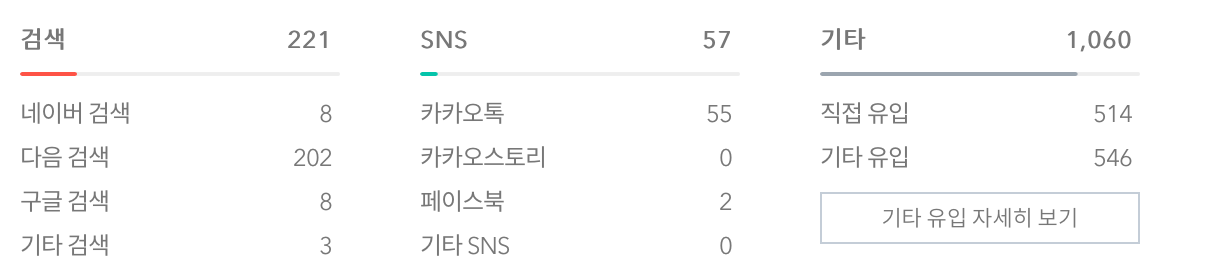이런 등록을 했음에도 아래 그림과 같이 검색방문자 수가 비 정상적으로 차이가 나는 것을 확인했다. (물론 이 모든게 무료로 사용한 사이트맵의 문제는 아닐꺼라 하지만, 내손으로 만든 녀석들에 대해 애정이 깊은 나로써는 사이트맵도 내가 만들자라는 생각을 하게 되었다.)