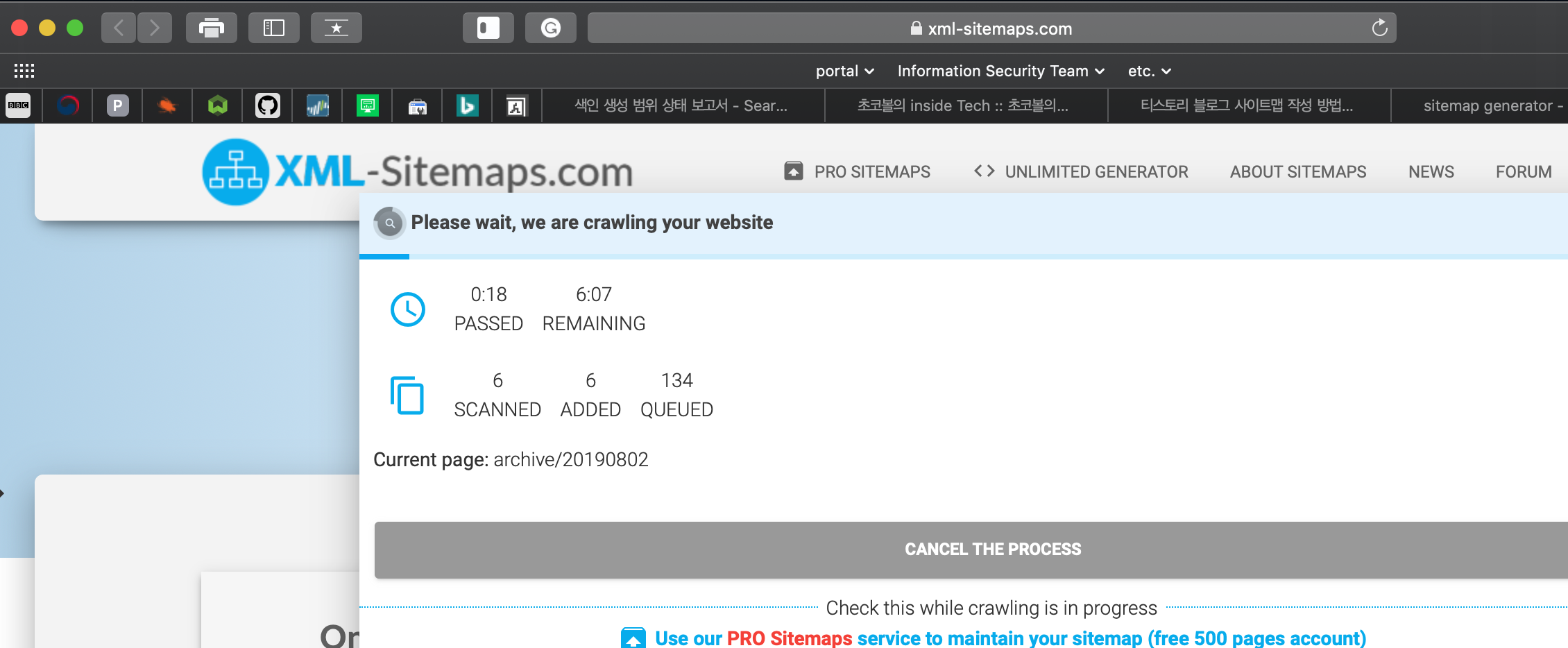사이트맵 등록과 관련해서는 이미 진행한 바 있었으나.. 몇 일동안 모니터링 해봐도 구글로 부터의 유입이 확인되지 않았다. 먼저 우선 등록을 진행했던 사이트맵 생성 사이트는 바로 https://www.xml-sitemaps.com이다.