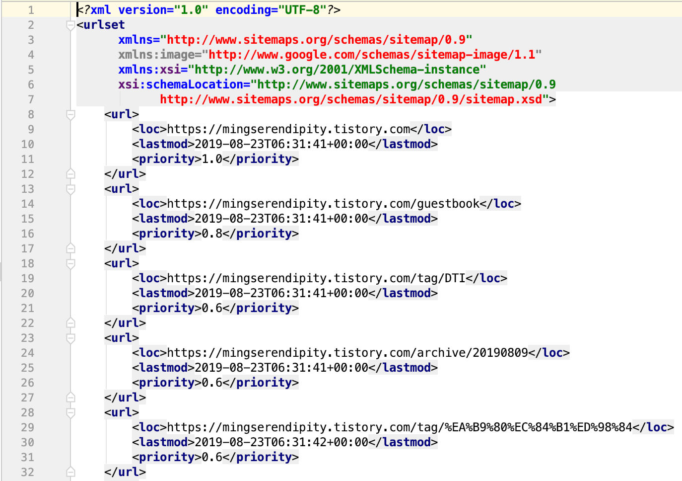 이런 과정을 거쳐서 내 스스로 만들어낸 sitemap.xml의 일부이며, 이를 자동화하여 주기적으로 관리를 해보려한다. 이걸 위해선 스크립트도 조금 더 손봐야할 것 같긴하지만...
