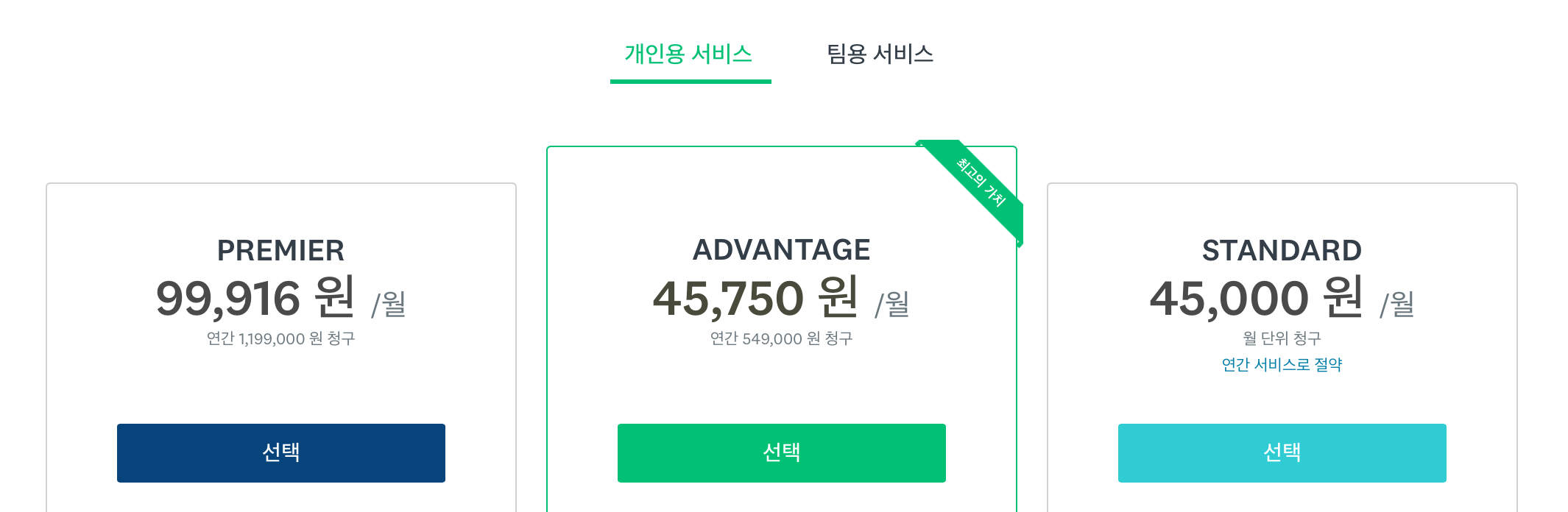 앞서서 말한 것 처럼 서베이몽키의 경우 유료버전와 무료버전이 있다. 무료 버전으로 설명을 하기에 앞서 요금제에 대해 간단히 보고 가도록 하겠다. 개인용 요금제와 팀용 요금제가 있는데 지나치게 한쪽 방향으로 치우쳐져 있다는 생각이 든다. (판단은 읽는 분들에게 맡긴다.)
