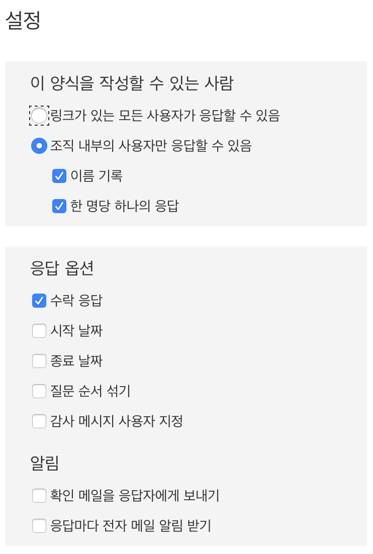 정말 많은 수의 사람들이 사용하고 있는 도구이지만 실제 검토는 가장 마지막에 하였으며 회사 업무에 적용하지 못하고 나가리(?)되었다. 무료로 제공함에도 주어지는 기능들은 앞선 1번 도구 서베이몽키에서 유료로 제공하는 수준으로 사용할 수 있으나 회사업무용으로는 적용할 수 없었다. 그 이유는 타 플랫폼과의 연동이 쉽지 않으면 사용자가 google 계정이 있어야 한다는 것이다. (물론 대부분의 사용자는 google 계정이 있다. 하지만 회사에 알리고 싶은 사용자는...적다.. 당연하다..나도 그렇다..이게 최종 결정에서 탈락한 이유이다.)